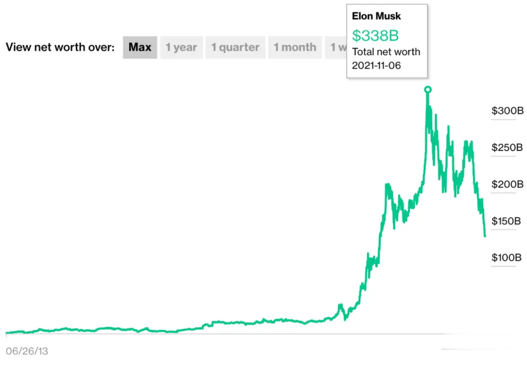 伴随特斯拉市值暴跌的是马斯克身价缩水,从一年前的3380亿美元跌到了如今的1390亿美元。