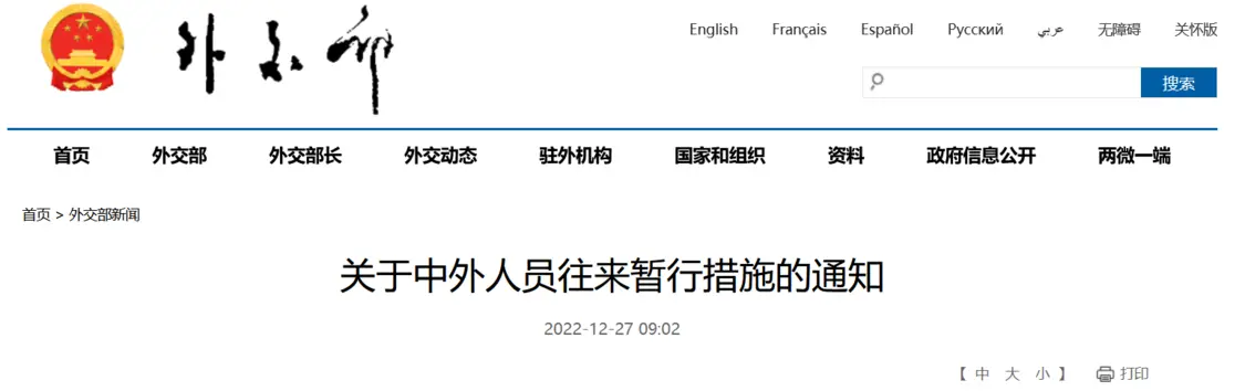 12月27日,外交部发布《关于中外人员往来暂行措施的通知》