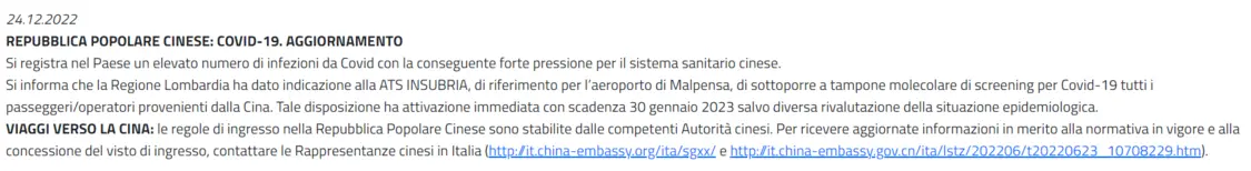 意大利外交和国际合作部网站ViaggiareSicuri报道称,自12月24日起,米兰马尔彭萨机场将对所有来自中国的旅客(不分国籍)进行入境新冠核酸检测。这一政策暂时执行至2023年1月30日,到期后将重新评估是否延续。