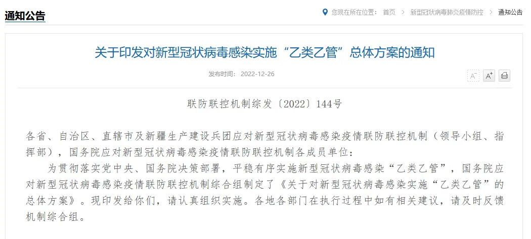 12月26日,国家卫健委网站发布《关于印发对新型冠状病毒感染实施“乙类乙管”总体方案的通知》。