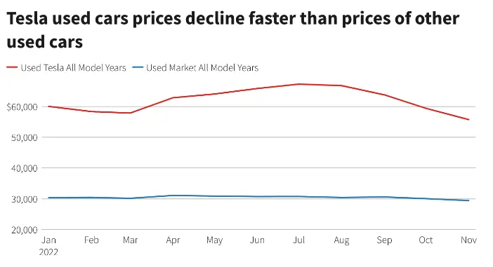 根据美国汽车咨询公司Edmunds的数据,今年11月份,二手特斯拉的平均价格为55,754美元,较7月份的峰值67,297美元下降了17%。整个二手车市场的价值在此期间下降了4%。11月,二手特斯拉在经销商库存中的平均时间为50天,而所有二手车的库存时间为38天。