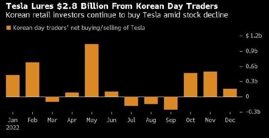 在疫情期间大幅增加股票投资的韩国散户投资者中,特斯拉仍然是最受欢迎的海外股票。该公司CEO埃隆·马斯克在这个亚洲国家有大量的忠实粉丝,除了前两年股价飙升期间涌入的买家之外,在2022年的大跌中也吸引了逢低买入的散户。