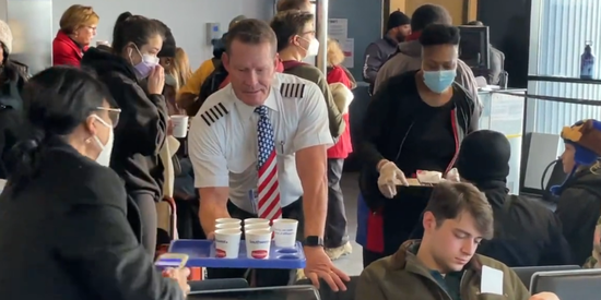 一位困在巴尔的摩的西南飞行员为同机乘客送来咖啡。  图片来源:@EricFlackTV
