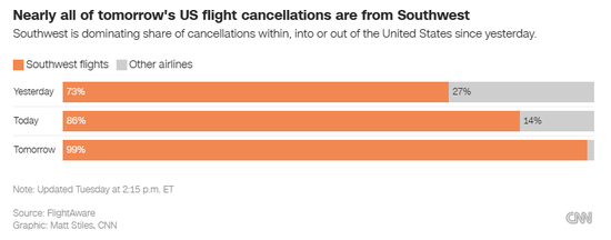 这也是为什么从本周一开始,西南航空的航班取消越来越多,旅客和行李积压越来越严重。