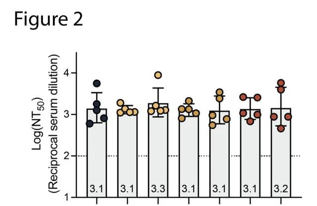 结果显示,A组和B组的恒河猴都表现出强烈的免疫反应。对原始毒株、BA.4/5、SARS-CoV-1和BQ.1的平均NT50值分别约为10^4、10^3.5、10^3和10^3(图5A-H)。