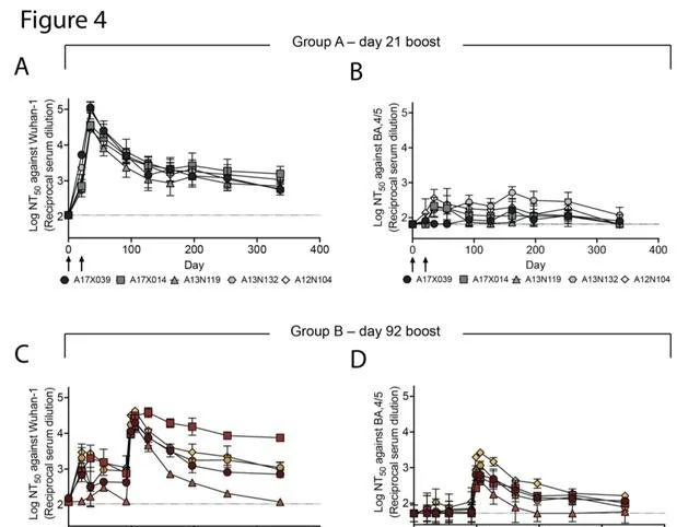 根据加强免疫14天的评估,更晚接种加强针的恒河猴可以产生更好的中和抗体(图3C和D);平均而言,B组对不同变种的中和反应相对于A组增加了约4倍。