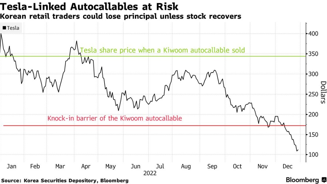 据了解,这些产品是卖给韩国散户投资者的,即使在特斯拉股价今年下跌近70%的情况下,他们仍然对特斯拉非常忠诚。其中一些自动赎回证券是在特斯拉股价超过每股300美元时发行的,这意味着在可自动赎回证券到期前(通常在一到两年内)需要反弹60%或以上,否则本金将被没收。