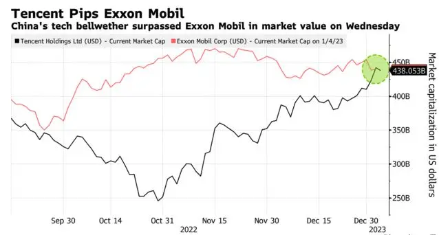 在整体股市的带动下,腾讯股价周三在香港交易所一度大涨4.6%,超越了埃克森美孚成为世界市值第十高的公司。截至周三港股收盘,腾讯市值约为4420亿美元,高于埃克森美孚的4399亿美元,但仍不及巅峰时的一半。2021年1月,腾讯市值曾触及9490亿美元。去年12月初,腾讯超越台积电成为亚洲最具价值公司,在那之后两家公司的差距一直在拉大。