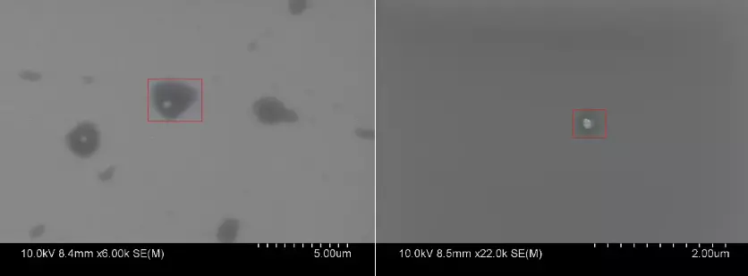 左图是用比较小的放大倍率,在大视野范围下观察样品形态,每单位标尺是0.5μm,可以发现被红框圈出的颗粒直径在500纳米以下,为了更精确得出它的直径大小,我们对此区域进行放大观察,得到右图,每单位标尺是0.2 μm,这个颗粒直径大约是半个标尺,也就是在100纳米左右。