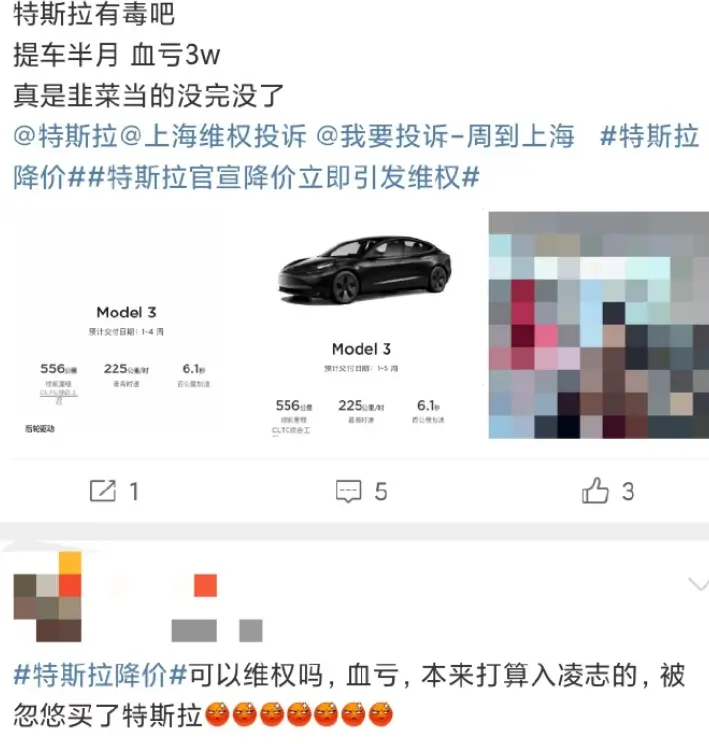 有车主在网络上发帖称:“特斯拉降价,他不到一个月就亏了三万五,上海准备维权的群请拉一下他”、“2022年买车的车主就是个笑话,特斯拉维权走起”。