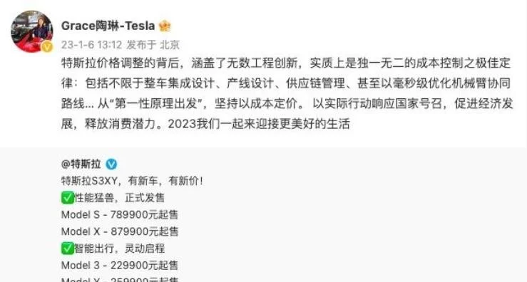 对此,特斯拉对外事务副总裁陶琳发布微博称,“特斯拉价格调整的背后,涵盖了无数工程创新,实质上是独一无二的成本控制之极佳定律:包括不限于整车集成设计、产线设计、供应链管理、甚至以毫秒级优化机械臂协同路线… 从‘第一性原理出发’,坚持以成本定价。”