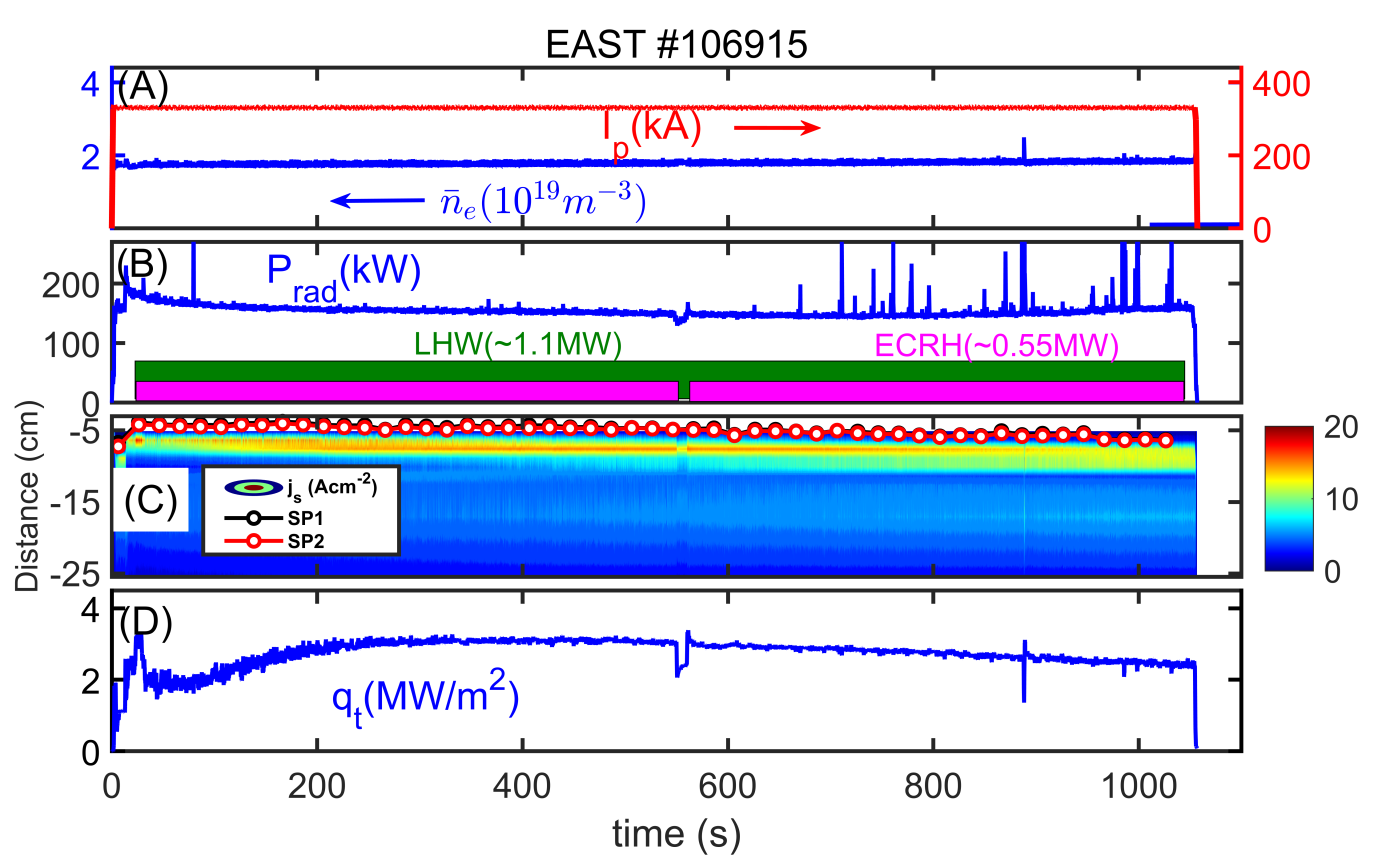 千秒长脉冲放电。0.33MA等离子体电流和平均密度 (A),辐射功率和辅助加热功率1.65MW(B),离子饱和电流以及内外靶板打击点SP1和SP2(C),偏滤器热通量峰值(D)。