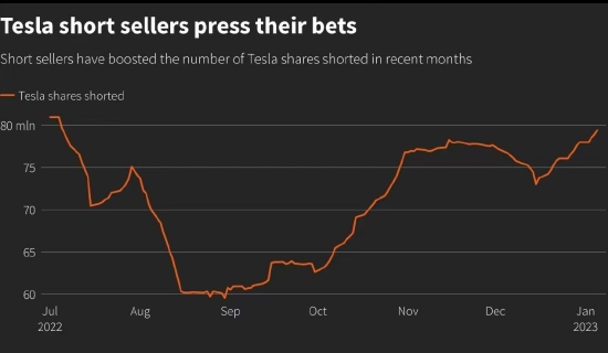 据报道,在结束了有史以来最赚钱的2022年,特斯拉股票的卖空者在新年伊始又给这家电动汽车制造商带来了更大的压力。分析公司S3 Partners的数据显示,希望通过出售借来的股票,并在稍后以更低的价格买回这些股票而获利的交易商,已将他们对特斯拉的空头头寸增加到约7900万股,相当于在过去的30天增长了近4%,约3.25亿美元。