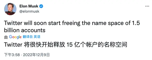 在收购Twitter四天后,马斯克就在Twitter上表示,他“肯定”会清理那些已经一年不活跃的账户,其中一些账户拥有令人垂涎的用户名。去年12月,他再次表示,Twitter将释放那些“多年来未发推文、也未登录,明显被放弃”的账户名称。