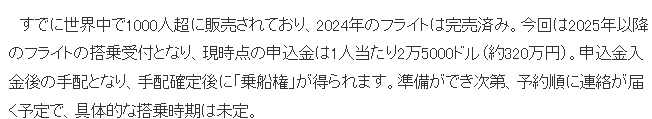 ·听上去很刺激吧,实际上截至2024年的全部1000多个票位已经售空,本次的预订票是2025年以后的座位,定金2.5万美金,感兴趣的小伙伴赶紧下手吧,不然真的排到很久以后了。