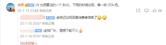 针对此事,理想汽车CEO李想本人也在相关视频的评论区出现,并留言称“J5光感算法的一个BUG,下雨的时候出现,等一版OTA吧”。