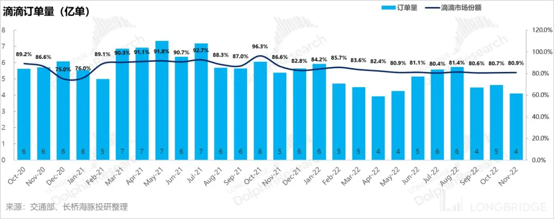 据长桥海豚投研分析显示,从目前交通部的数据来看,滴滴下架之前其网约车订单量市占率大约是在90%左右,下架之后大概十个月之内从90%掉到了80-81%之间,2022年的市占率基本稳定在了80%这个水准上。