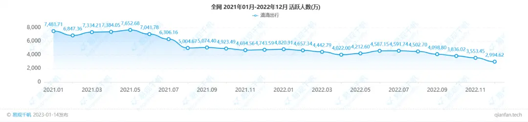 数据也显示,在滴滴APP下架的一年半时间里,滴滴APP的月活跃人数亦的确受到了影响。如下图所示,2021年7月,滴滴APP的月活跃数据开始掉头朝下,最新的2022年12月月活跃人数已不足3000万,与2021年上半年的活跃人数相比已然腰斩