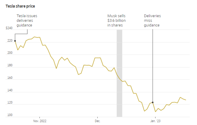 披露四季度交付量再度逊于市场预期次日,特斯拉股价盘中暴跌15%,收跌12%,收盘价比12月马斯克抛售特斯拉的均价低近34%。如果马斯克在交付量披露后出售,将损失12亿美元。除了可能因为四年前的一条私有化推文赔上几十亿美元,特斯拉CEO马斯克还面临涉嫌内幕交易的新麻烦。