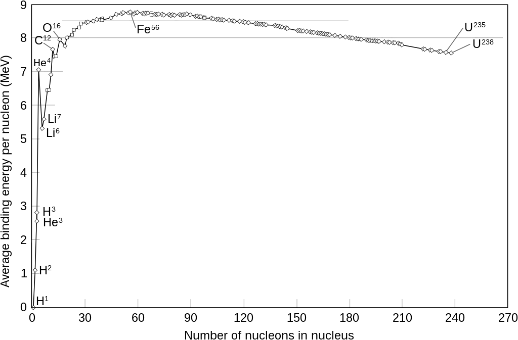 从图中可以看出H1具有的平均结合能最小(因为它只有一个质子,还没有结合),Fe56的平均结合能最大。凡是平均结合能比Fe56小的原子核,都可以通过核反应向Fe56靠拢并释放能量。在Fe56左边的原子核可以通过聚变变成Fe56,而在右边的原子核可以通过裂变变成Fe56。
