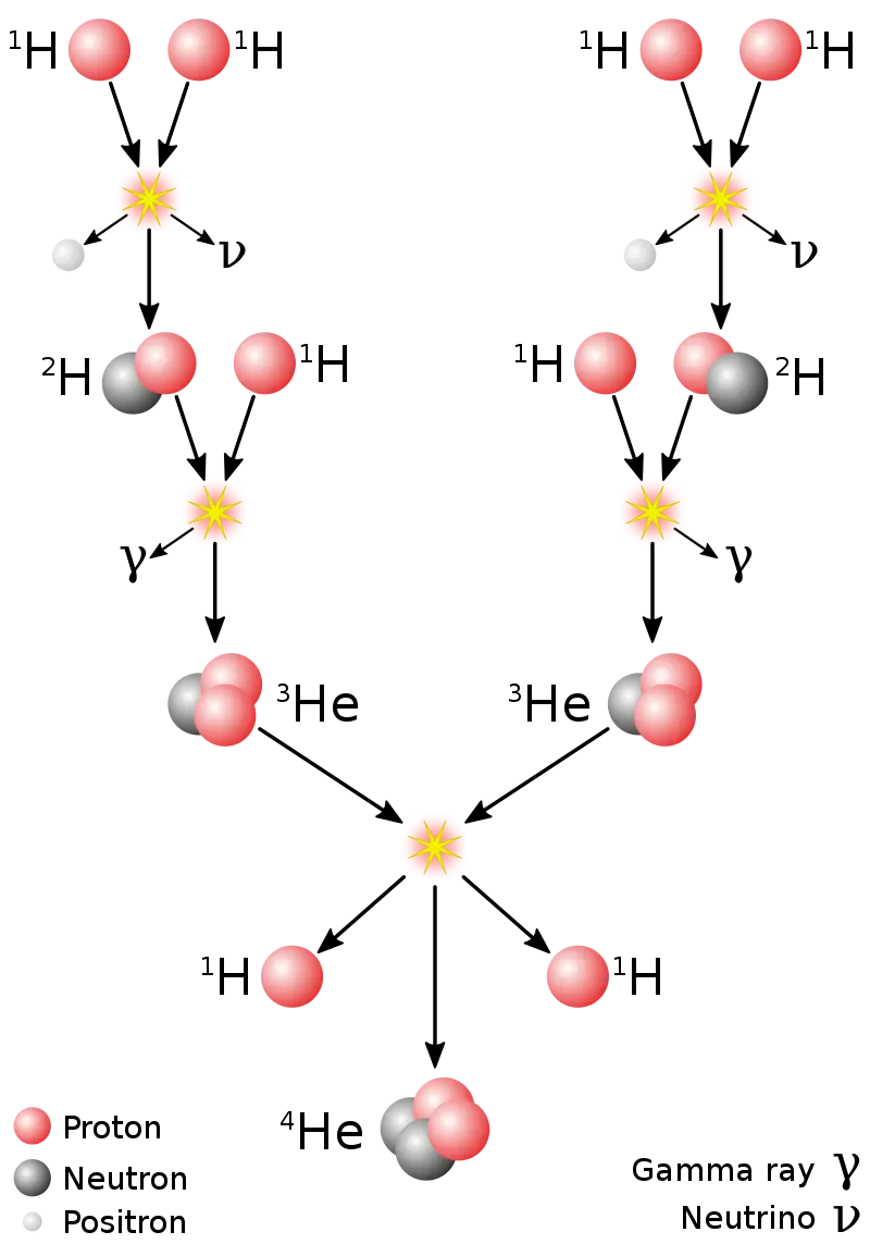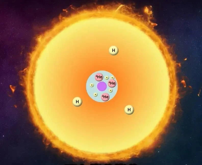 我们的太阳正处于青壮年时期,天文上称为主序星阶段。它大约四分之三是氢,四分之一是氦,还含有少量的氧、碳、氖、铁。太阳发光发热的能量来源,主要是它里头的氢在发生聚变,每4个氢1(质子)会聚变成一个氦核,这被称为质子-质子链反应。