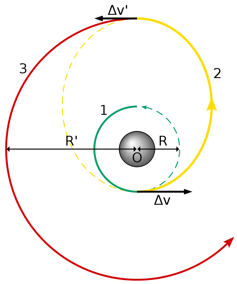 现在的航天技术也是采用这种加速方向来实现从低轨道升到高轨道,大部分情况下,这是最省燃料的变轨方式,也称霍曼转移轨道。