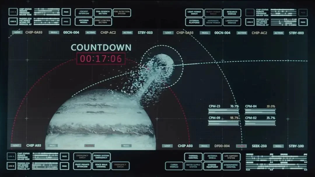 在第一部电影中,地球在借助木星引力弹弓增速时一个不小心没控制好轨迹,即将坠入洛希极限,如果不想办法施加更大的推力逃离,就会被木星引力撕碎,成为木星环的一部分。