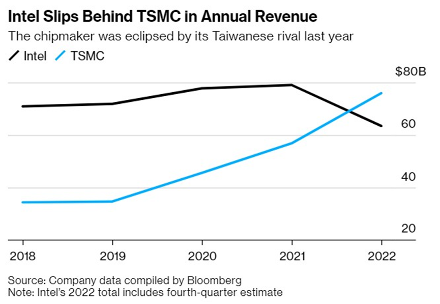 从市场竞争格局来看,外媒普遍认为,英特尔的最新财报证明了其在芯片领域进一步落后于主要的竞争对手——台积电和三星电子。目前来看,英特尔2022年的总营收已低于台积电(TSM.US)。