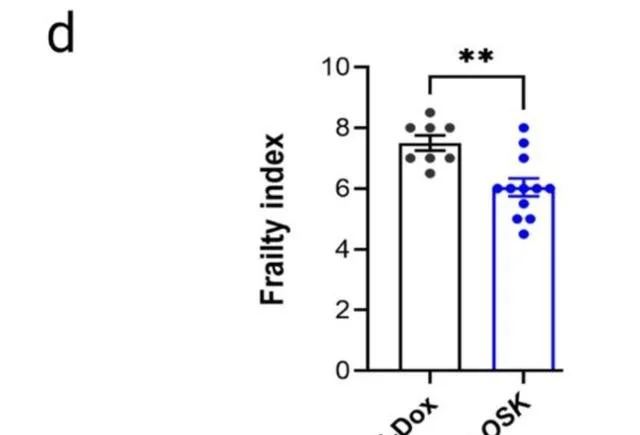 从结果看,实验组(蓝色)虚弱度更低,这意味着,重编程基因组健康度也明显比对照组更好。
