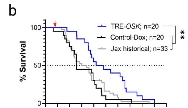 通过观察,研究者发现,重编程实验组的小鼠(蓝色线)整体生存周数明显更多,无论对比同期对照组,还是过去数据,剩余寿命中位数都延长了109%。