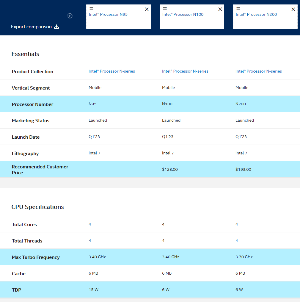 通过查询发现,N95已经低调出现在了Intel ARK产品数据库中,其规格相比N100、N200也有明显不同。