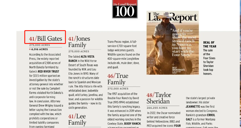 除了微软创始人,比尔·盖茨还有个身份——美国最大的私人土地所有者之一。根据2022年度的《土地报告100(The Land Report 100)》,盖茨在美国拥有约27.5万英亩(约为1112.89平方公里)的农田,坐稳美国最大农田主之位。他拥有的农田面积相当于上海市面积的六分之一,接近于上海浦东新区的面积(1210平方公里)。