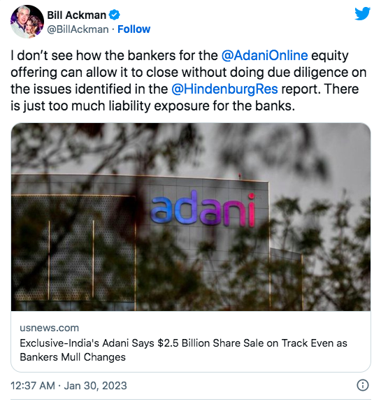 Ackman是在点评阿达尼企业(Adani Enterprises)将继续推进公开募股相关新闻时发布的上述推文。据媒体报道,在遭空头狙击之际,阿达尼企业25亿美元的股票发行仍在按计划进行,但由于该集团股价大跌,银行家正在考虑延长交易期限或下调发行价。