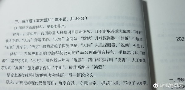华为相关内容又进入教材了,这次还是考生题库。有博主爆料称,华为麒麟芯片和鸿蒙OS等自研智慧成果再一次亮相试题库,并成为了考生写作的材料。从晒图看,该写作题就我国极具影响力的科技公司的产品名称进行了盘点。并表示这些产品名称很有特色,其中包括手机芯片“麒麟”、操作系统“鸿蒙”、服务器芯片“鲲鹏”等。