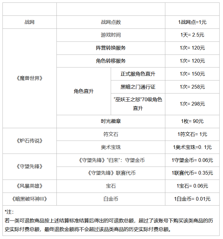 2.玩家需前往“暴雪游戏服务中心”公众号提交退款申请,最终退款金额将以停运后玩家账号内实际剩余的可退款商品数量为准,且不会超过该账号可退款商品的历史累计付费金额。