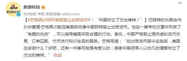 对加密货币,股神巴菲特和他的好友芒格一直不太看好,芒格曾经就在美国呼吁打压加密货币,但由于监管松弛,加密货币在美国并未得到禁止。2月3日,芒格近日发表专栏文章再次抨击了加密货币,呼吁美国禁止这种虚拟货币。中国对加密货币有严密的监管政策,这次芒格毫无疑问再次提到了中国。
