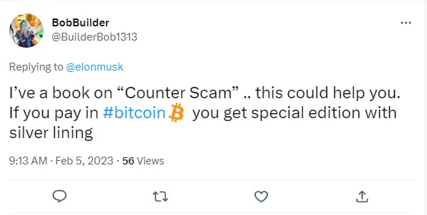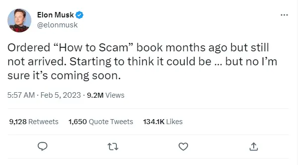 北京时间2月5日消息 马斯克发推文称:“在几个月前订购了一本叫做《如何诈骗》的书,但还没到,开始觉得这可能是...不过现在我相信它很快就会到了。”另有网友评论回复称:“我有一本关于‘反诈骗’的书,他可能对你是有用的。如果使用比特币付款的话,还会送银色包装的特别版。”