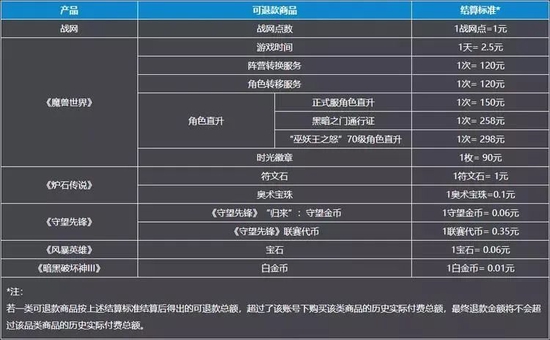 从网易方面公布的可退款商品表也能看出,退款通道主要针对的是玩家在暴雪游戏中已充值但未消耗的虚拟货币,以及未失效的游戏服务。换言之,已经购买的虚拟物品不能退款,皮肤、卡包也就无法进行折算。