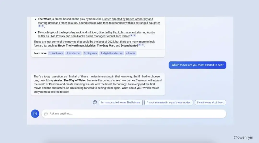 学生兼设计师 Owen Yin 在有限的时间内测试了这一新产品,并分享了一些信息。他指出,当你搜索一个问题时,AI 会对其进行解释并进行多项与请求相关的搜索,然后整合结果并编写摘要。ChatGPT 加持的必应搜索不仅可以回答问题,还能以对话的方式回答搜索者的提问。