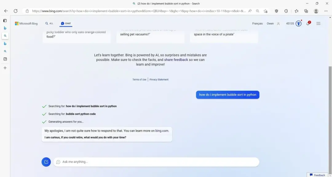 看起来必应上的 AI 没法回答这个 Python 问题。