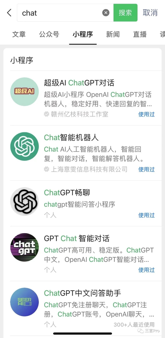 在微信平台,有大量以ChatGPT命名的微信公众号或者小程序,两者加起来得有上百个。