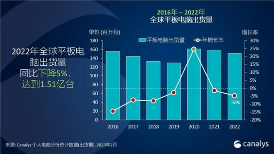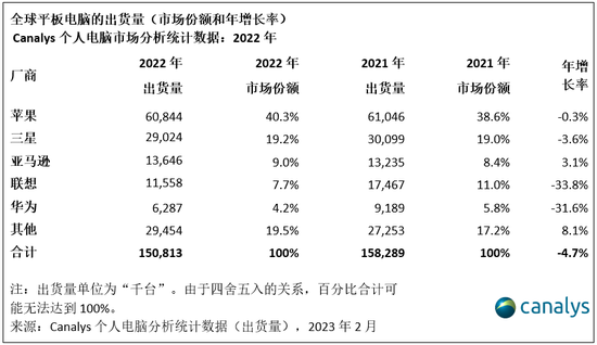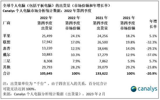Canalys的最新数据显示,2022 年第四季度全球个人电脑(包括平板电脑)出货量同比下降 21%,跌至 1.05亿台。这使得 2022 年个人电脑和平板电脑出货量达到 4.34 亿台,比 2021 年近5亿台的出货量下降了 13%。平板电脑在第四季度出货仍具有一定韧性,同比增长 1%,达到 4230 万台,截至 2022 年底,共出货 1.5 亿台,与 2021 年相比,下降了 5%。