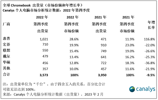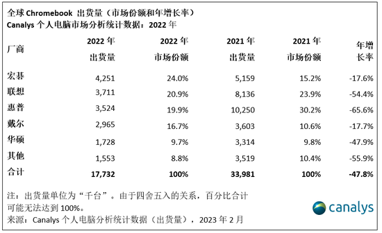 2022 年第四季度,Chromebook笔记本电脑出货量达到 360 万台,同比下降 10%。2022 年全年出货量达到 1770 万台,相比 2021 年的出货量高峰,大幅下降48%。
