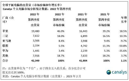 在连续三个季度下滑之后,全球平板电脑出货量有所增长,2022 年第四季度同比小幅增长1% 。苹果主要得益于新一代M2 iPad的推出,依然稳居市场首位,出货量达到 1900万台,全球市场份额占比高达 46% 。三星以 760 万台的出货量位居第二,出货量增长10%,市场份额占比 18%。亚马逊出货量达到 350 万台,同比下降 10%,位列第三。在黑色星期五前后,亚马逊对其Fire平板电脑进行大幅打折促销活动,从而避免了出现更大降幅。联想和华为分别以51%和36%的跌幅排名第四和第五。其他厂商的总出货量小幅增长 4%,不难看出新进入平板电脑市场的厂商表现乐观。 Canalys分析师Himani Mukka表示:“尽管经济状况不佳,但对平板电脑的需求仍然相对健康。头部厂商苹果通过推出新的高端产品,帮助推动市场整体增长。这表明消费者将对有吸引力的创新产品给出积极回应。第四季度,在消费领域,厂商和零售商在节日季推出大幅折扣和促销活动,消费者的预算也有所增加。而在商用领域,企业和政府都对IT支出采取了更加谨慎的态度,搁置了一些包括平板电脑采购在内的数字化转型计划。”