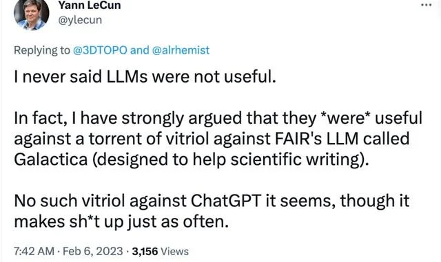 我从来没说大型语言模型没用,其实我们Meta也推出过Galactica模型,只是它不像ChatGPT那么好命罢了。