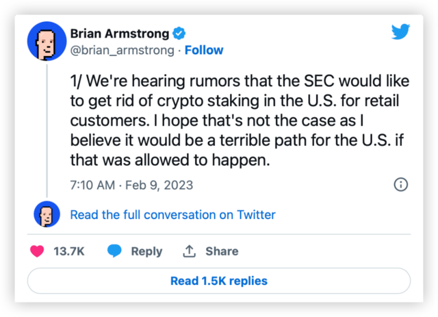 据媒体报道,Coinbase的CEO Brian Armstrong已在周三晚间了解到了Kraken和SEC的和解协议。他指责SEC想要彻底剥夺散户参与链上质押的机会,并且称质押“是一项非常重要的创新”。