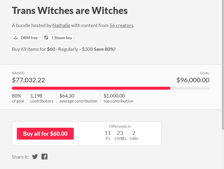 在这款售价60美元,名为Trans Witches Are Witches的捆绑包中,包括魔术主题游戏、音乐、杂志和来自LGBTQ+ 创作者的其他内容。如果单独购买,这些内容将花费 300 多美元。这些捆绑包的收益由创作者平分。目前,该捆绑包已筹集超过77000美元。此外,还有一个售价10美元的姐妹捆绑包,目前已筹集超过10000美元。