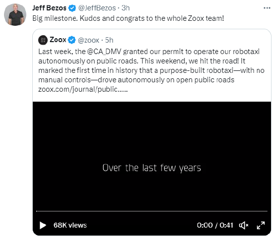 当地时间周一,亚马逊旗下自动驾驶汽车公司Zoox表示,已成功在公共道路上以员工为乘客测试了一辆Robotaxi,此举让该公司更接近为公众提供商业服务的目标。对此,亚马逊创始人杰夫·贝索斯在社交媒体送上祝福。