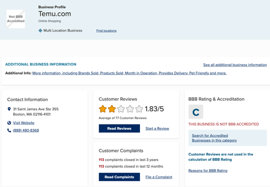 不过,要在美国做跨境电商并不容易,需要组建完善的客服体系。在美国消费者评价网站BBB上,Temu的评分只有1.8分(满分5分)。不少投诉都是关于产品质量差,无法联系客服。