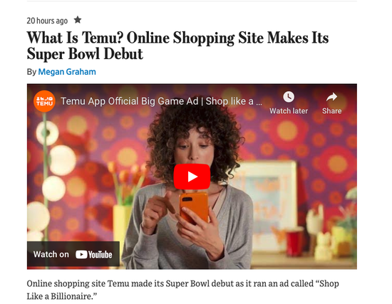 超级碗结束之后,一家神秘的创业公司顿时成为了全美讨论热点,甚至登上了《时代》周刊和《华尔街日报》的报道。仅仅创办四个月的电商平台Temu居然投入了超过1400万美元,购买了两次超级碗30秒广告位,吸足了全美电视观众的眼球。